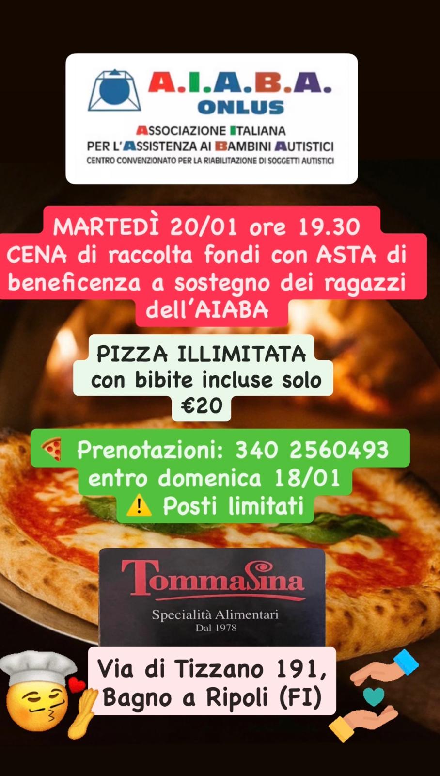 Siamo lieti di invitarvi a una serata all’insegna della solidarietà, del buon cibo e del divertimento! Martedì 20 gennaio, l’AIABA organizza una cena di raccolta fondi speciale presso la pizzeria Tommasina (via di Tizzano 191 Bagno a Ripoli).